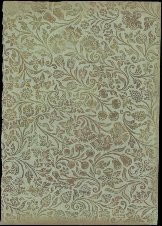 Blad groen geverfd bronsvernispapier met bloemmotieven, oud boekomslag