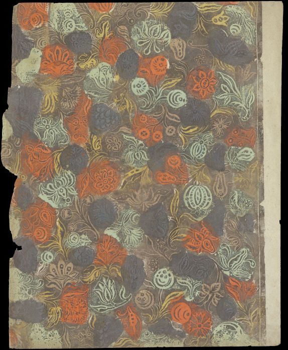 Blad veelkleurig bedrukt bronsvernispapier met bloemmotieven, oud boekomslag