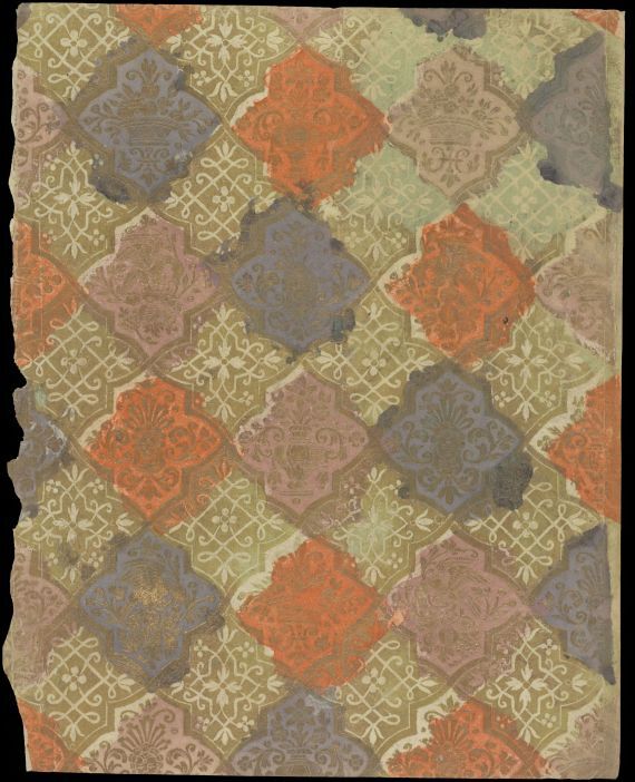 Blad veelkleurig geverfd bronsvernispapier met bloem- en vogelmotieven in ruitpatroon, oud boekomslag