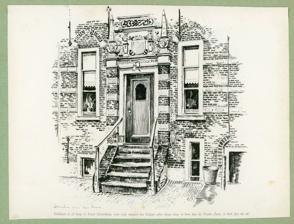 Eén van 6 zwart-wit foto's en 1 kleurenfoto van het Admiraliteitshuis in Dokkum