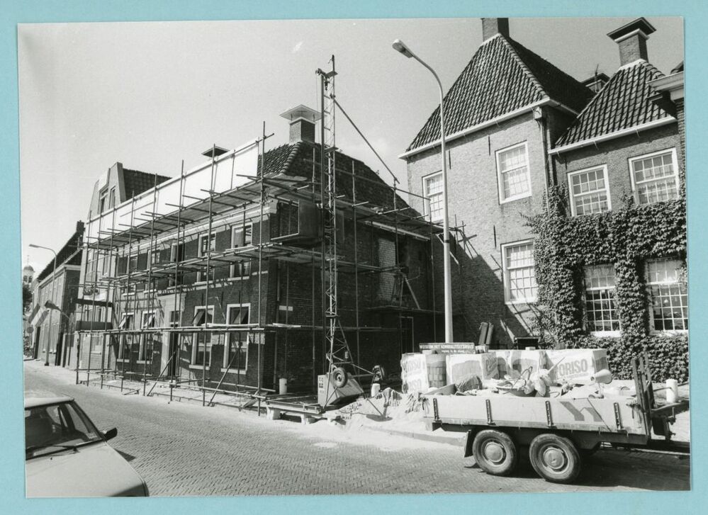 Eén van 6 zwart-wit foto's en 1 kleurenfoto van het Admiraliteitshuis in Dokkum