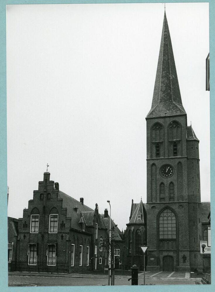Eén van 6 zwart-wit foto's van de R.K.-kerk en de doopsgezinde kerk in Workum