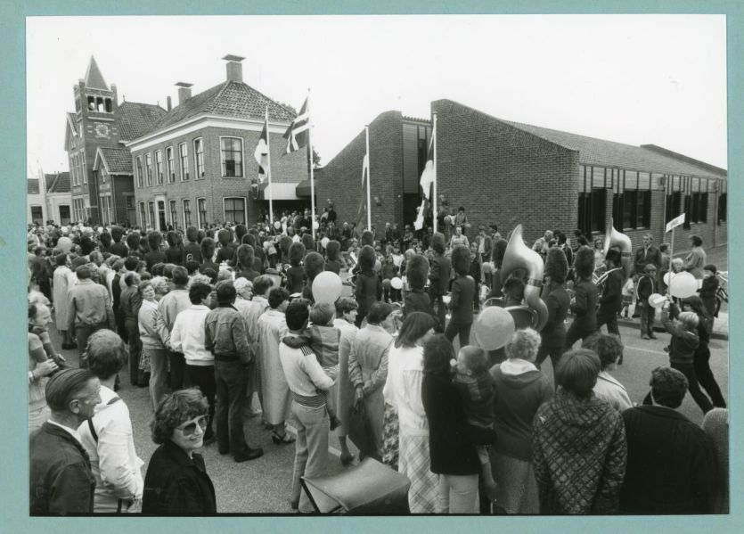Zwart-wit foto van de opening van het gemeentehuis te Grotegast