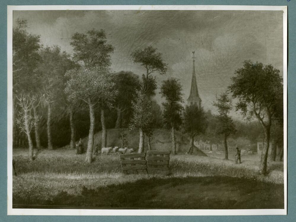 Gezicht op Nijland met kerktoren in 't geboomte, onderdeel van 51 zwart-wit foto's van Nijland