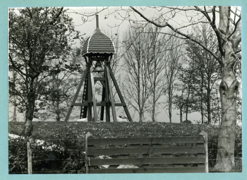 Eén van 6 zwart-wit foto's van de klokkenstoel te Ouwster-Nijega