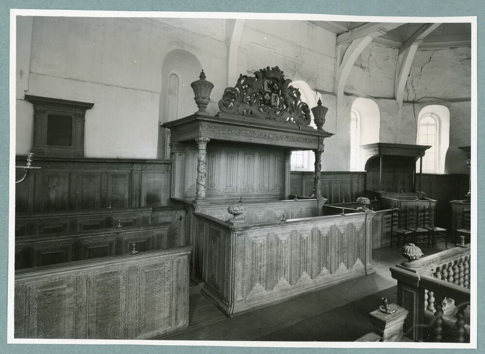 Overhuifde herenbank met het wapen van Burmania in de kerk te Weidum