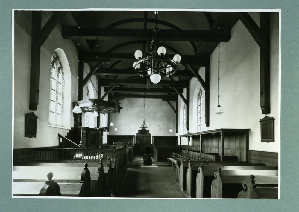 Eén van 14 zwart-wit foto's van de kerk van Wijnaldum en het interieur