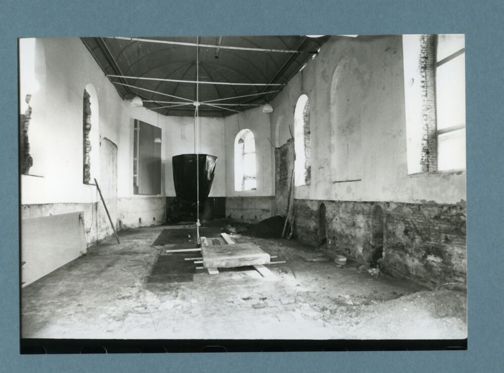 Het kale interieur van de kerk te Zweins tijdens de restauratie