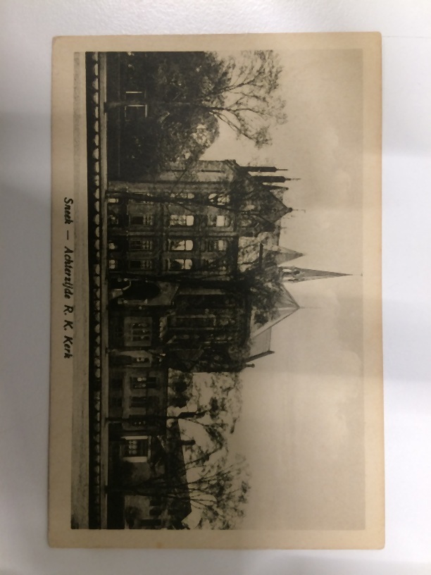 Eén van 2 ansichtkaarten van de achterzijde van de St. Martinuskerk te Sneek
