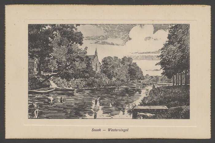 Eén van 59 diverse ansichtkaarten en 1 mapje met ansichtkaarten van Sneek