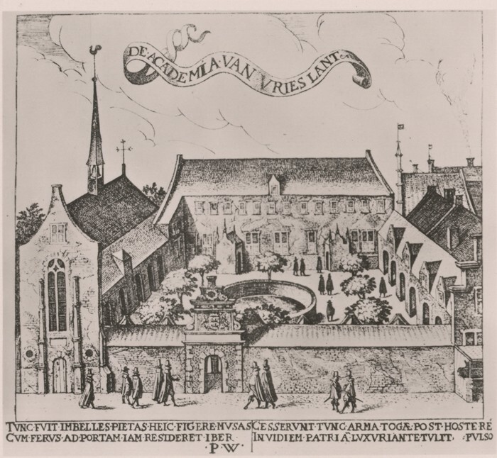 Prent waarop gebouw met binnenhof waarboven een banier waarop staat DE ACADEMIA VAN VRIES LANT