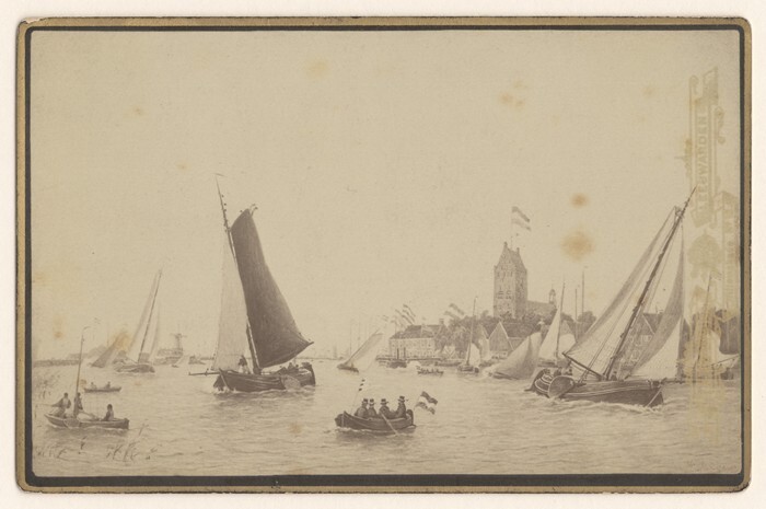 Prent met gezicht op haven en kerk van Grou