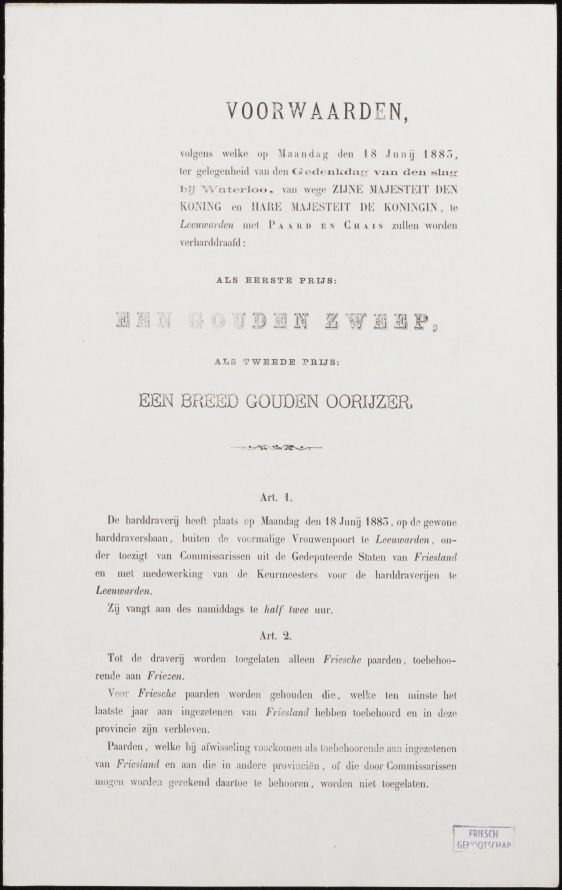 Voorwaarden volgens welke op maandag den 18 junij 1883 ter gelegenheid van den gedenkdag van den slag bij Waterloo [...] met paard en chais zal worden geharddraafd