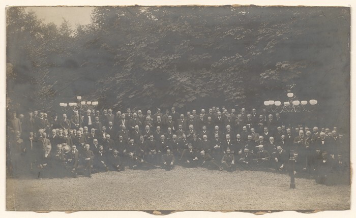 Grote groep mannen opgesteld in lange rij van vijf lagen