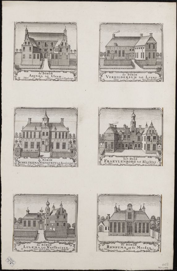 Vel met 6 afbeeldingen van dorpskerken en kastelen in de provincie Groningen