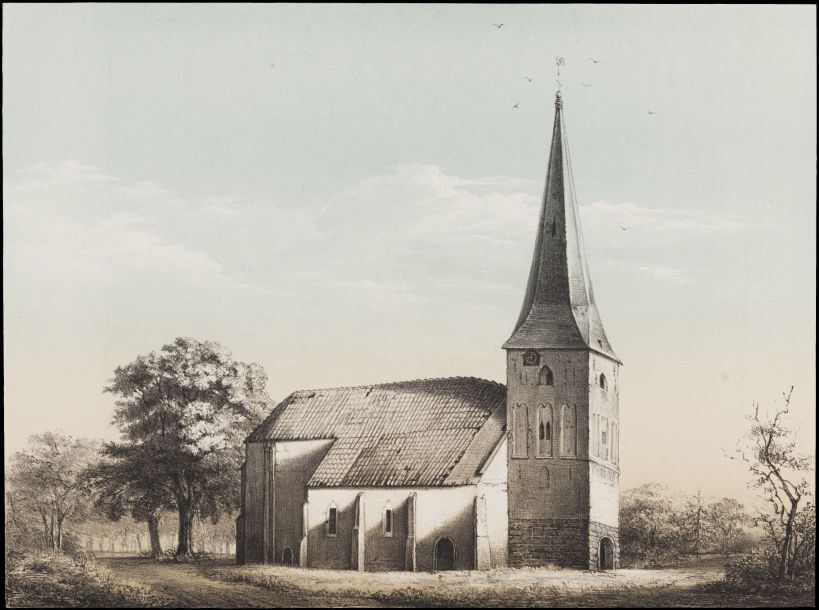 Map Drenthe met afbeeldingen van dorpen, dorpskerken en havezathen