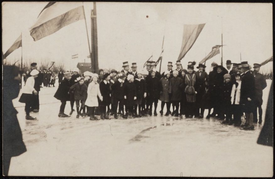 een zwart-wit foto betreffende schaatswedstrijden van de ijs-club en met kinderen