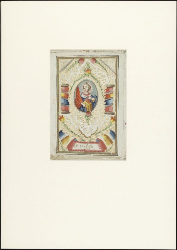 Devotieprentje met de afbeelding van een heilige. Kan een reliek van de afgebeelde heilige zijn opgenaaid. Gebruik gebedsprentje indien er een gebedstekst is toegevoegd. (Religieus Erfgoedthesaurus) https://data.cultureelerfgoed.nl/term/id/cht/0a117884-0cc2-4ee0-a223-8f6ce1fa8e67