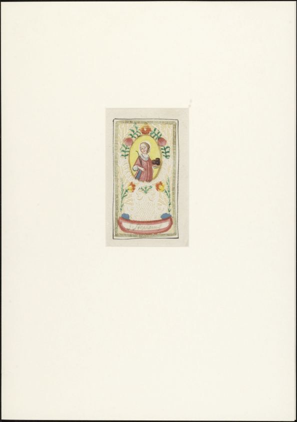 Devotieprentje met de afbeelding van een heilige. Kan een reliek van de afgebeelde heilige zijn opgenaaid. Gebruik gebedsprentje indien er een gebedstekst is toegevoegd. (Religieus Erfgoedthesaurus) https://data.cultureelerfgoed.nl/term/id/cht/0a117884-0cc2-4ee0-a223-8f6ce1fa8e67