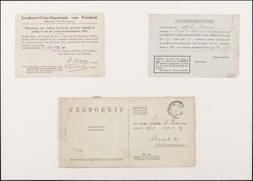 Envelop met divers materiaal relaterende aan het boerenbedrijf van Melle S. Rozema te Broek op Akkerwoude in de jaren '30 en '40