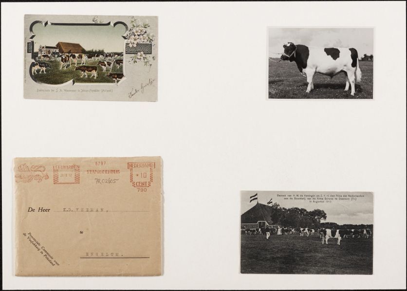 Envelop met foto's en ansichtkaarten van diverse koeien en boerderijen in Friesland