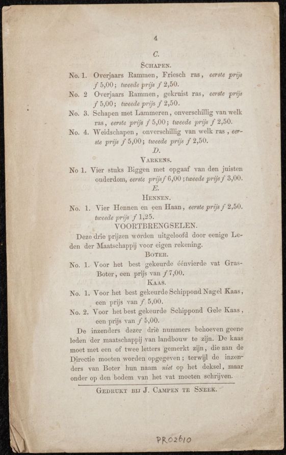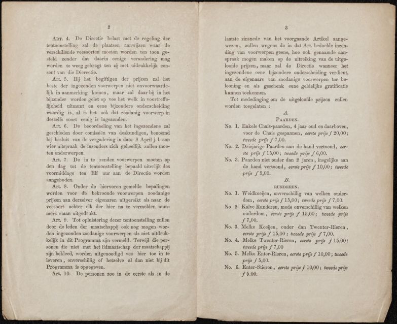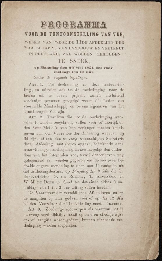 Programma voor de tentoonstelling van vee te Sneek, 29 mei 1854