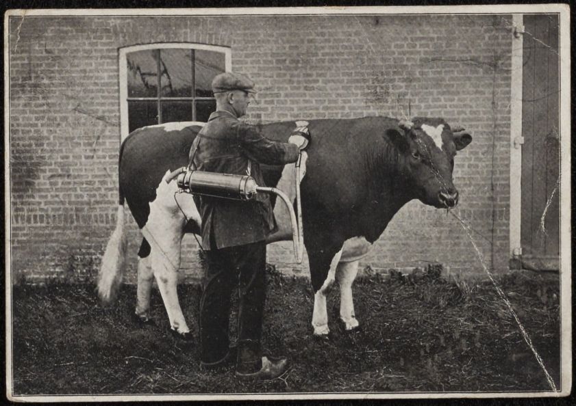 Boer demonstreert een scheerapparaat voor koeien; van de Provinciale Friesche Landbouw-Tentoonstelling te Leeuwarden 1927