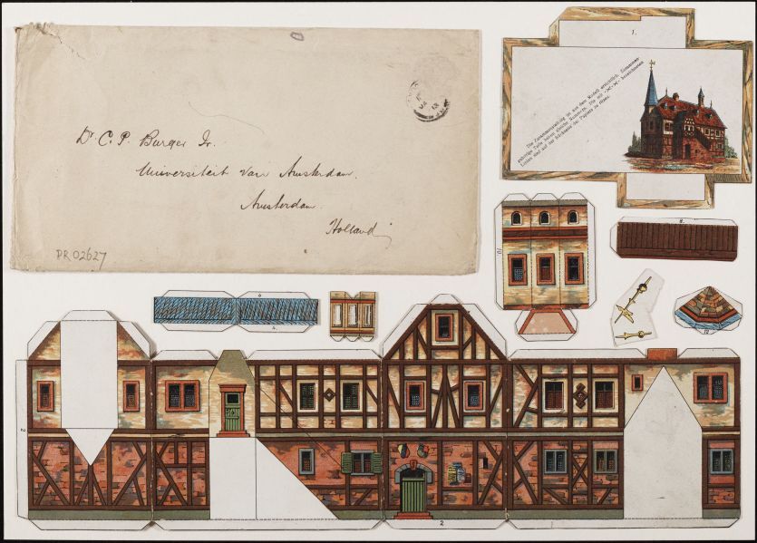 Envelop met onderdelen van een Duitse bouwplaat van een landhuis met torens