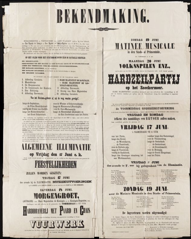Bekendmaking van de festiviteiten 17-19 juni 1892 tijdens het bezoek van koningin Wilhelmina en regentes Emma te Leeuwarden