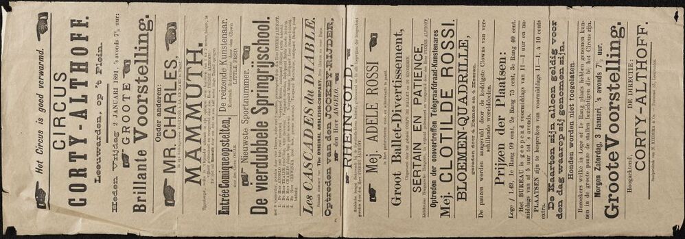 Programma van optreden van het circus Corty-Althoff, op 't Plein te Leeuwarden, 2 januari 1891