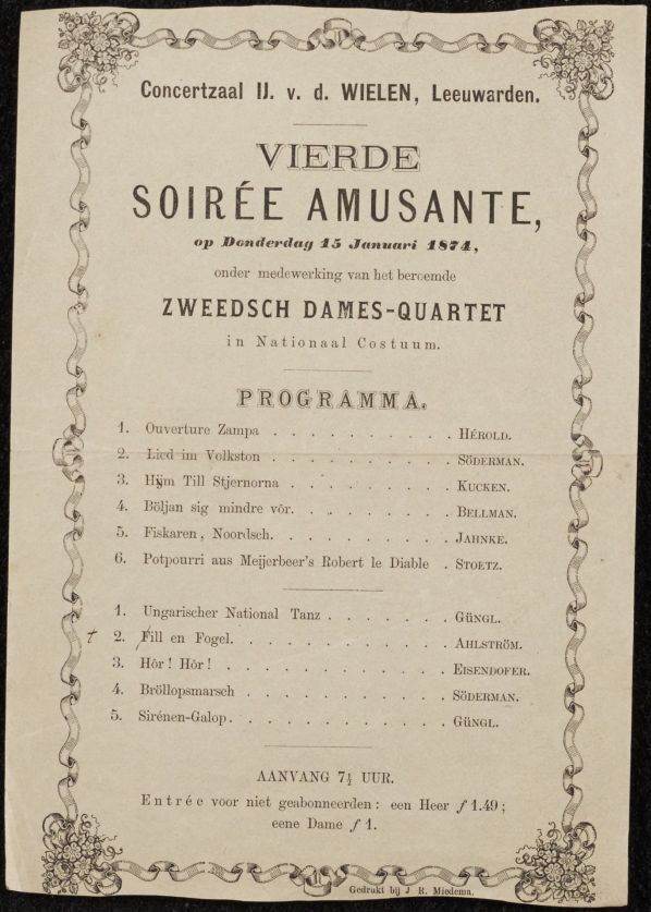 Programma van Vierde Soirée Amusante door het Zweedsch Dames-Quartet, in de concertzaal IJ. v.d. Wielen te Leeuwarden, 15 januari 1874