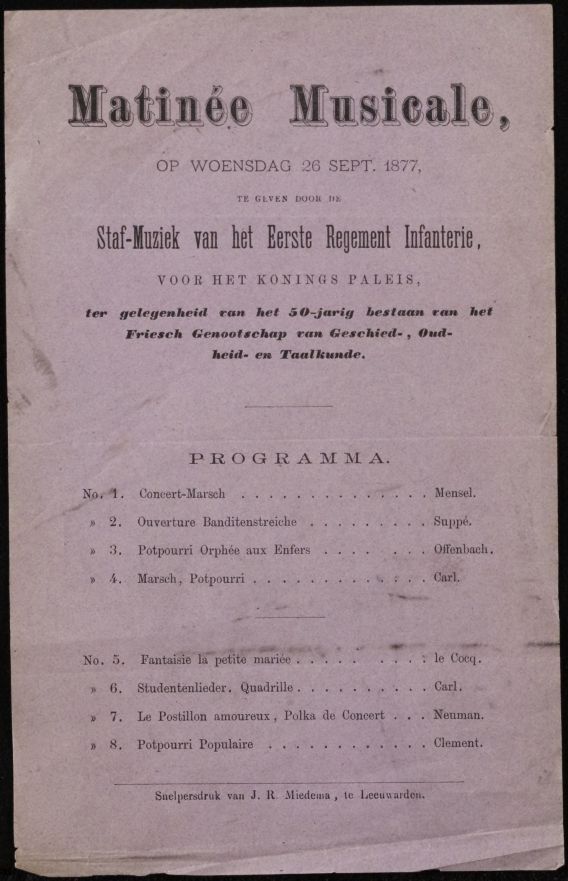 Programma van Matinmee Musicale op woensdag 26 sept. 1877,Staf -Muziek van het eerste Regement Infanterie,ter gelegenheid van 50 jr.bestaan Friesch genootschap