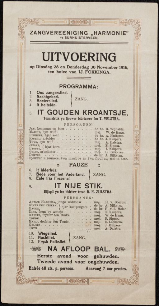 Programma van een uitvoering van de Zangvereeniging Harmonie te Surhuisterveen ten huize van IJ. Fokkinga, 28 en 30 november 1916