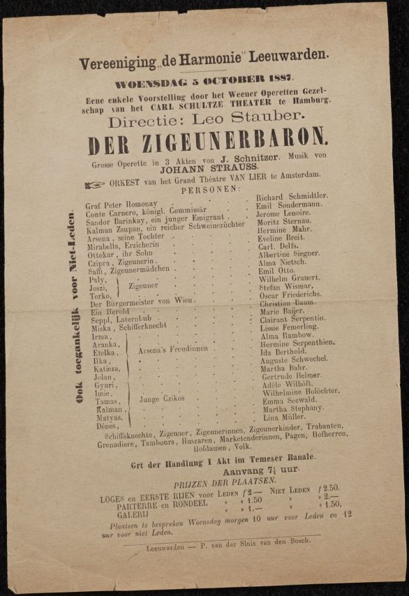 Programma van Der Zigeunerbaron door het Weener Operetten Gezelschap van het Carl Schultze Theater te Hamburg in de Vereeniging de Harmonie Leeuwarden, 5 october 1887
