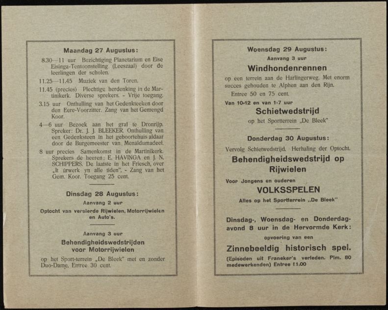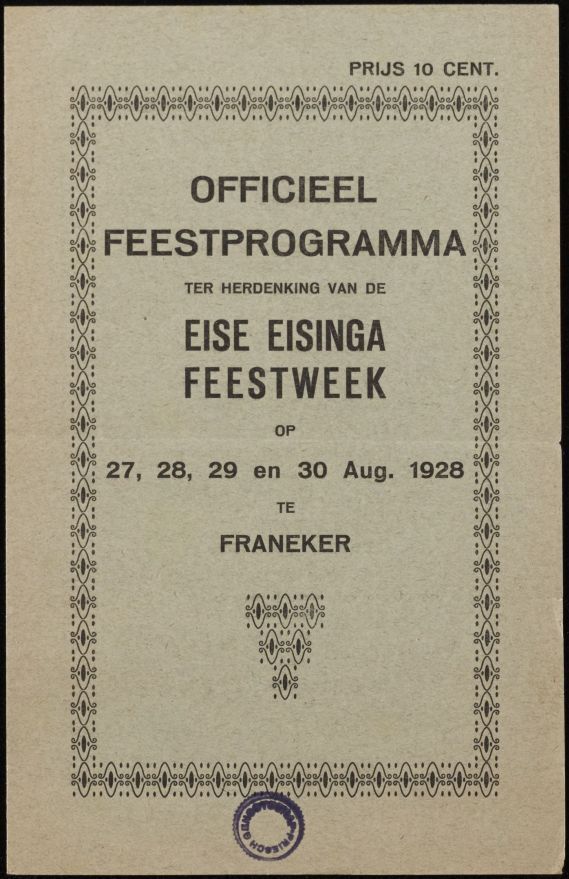 Officieel feestprogramma ter herdenking van de Eise Eisinga Feestweek op 27, 28, 29 en 30 augustus 1928 te Franeker