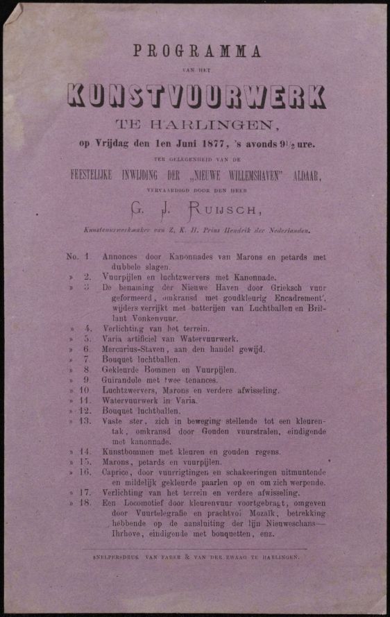 Programma van het Kunstvuurwerk te Harlingen op 1 juni 1877