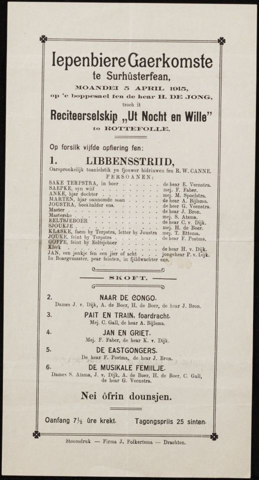 Programma (in het Fries) voor de opvoering van Libbensstriid door het Reciteerselskip Ut Nocht en Wille, Iepenbiere Gaerkomste te Surhuisterveen, 5 april 1915