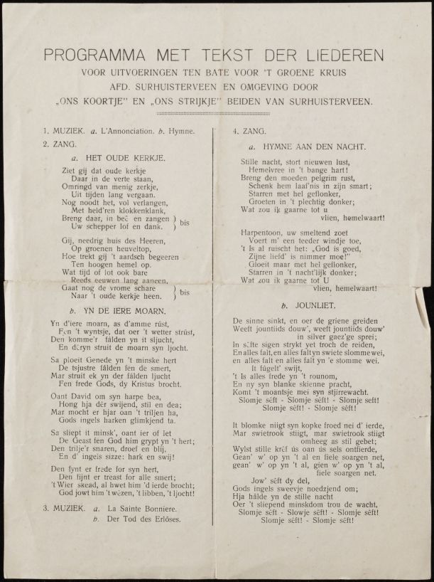 Programma met tekst der liederen voor uitvoeringen ten bate voor 't Groene Kruis afd. Surhuisterveen en omgeving door "Ons Koortje" en "Ons Strijkje" beiden van Surhuisterveen, zonder datum