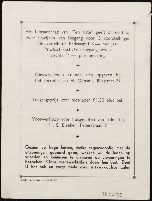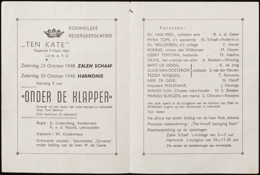 Programma van de opvoering van Onder de Klapper door de Koninklijke Rederijkerskamer Ten Kate in de Harmonie te Leeuwarden, 30 october 1948