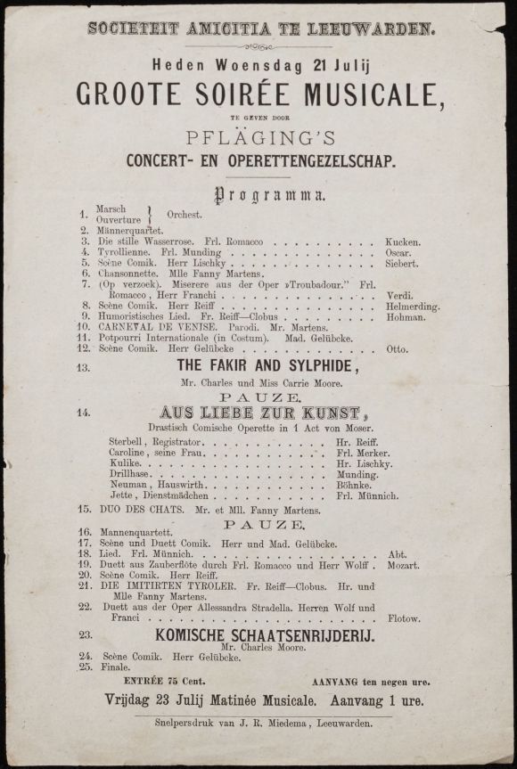 Programma van de Groote Soirée Musicale door Pfläging's Concert- en Operettengezelschap in Societeit Amicitia te Leeuwarden op 21 juli
