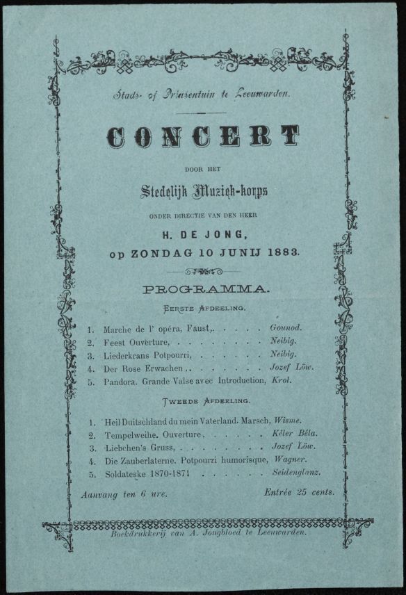 Programma van een concert door het Stedelijk Muziek-korps op 19 juni 1883 in de Stads- of Prinsentuin te Leeuwarden