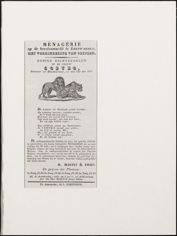Advertentie voor een optreden van de menagerie op de beestenmarkt te Leeuwarden