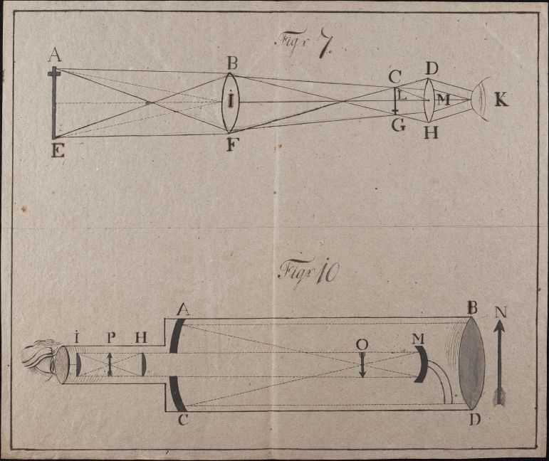 Blad met twee schematische figuren (7 en 10) van de werking van een de lenzen van een telescoop