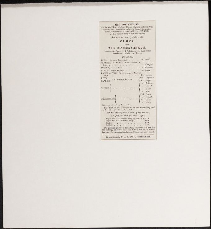 Programma van de opvoering van de opera Zampa oder Die Marmorbraut op 9 juli 1836 in de Schouwburg te Leeuwarden