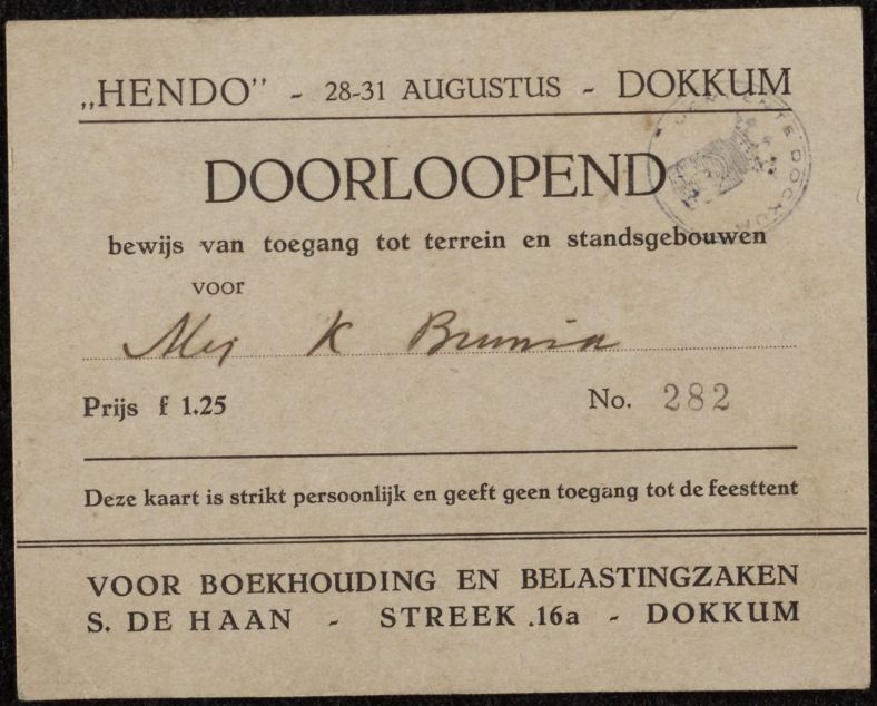 Toegangsbewijs tot Hendo te Dokkum, 28-31 augustus 1931, op naam van Mej. K. Brunia