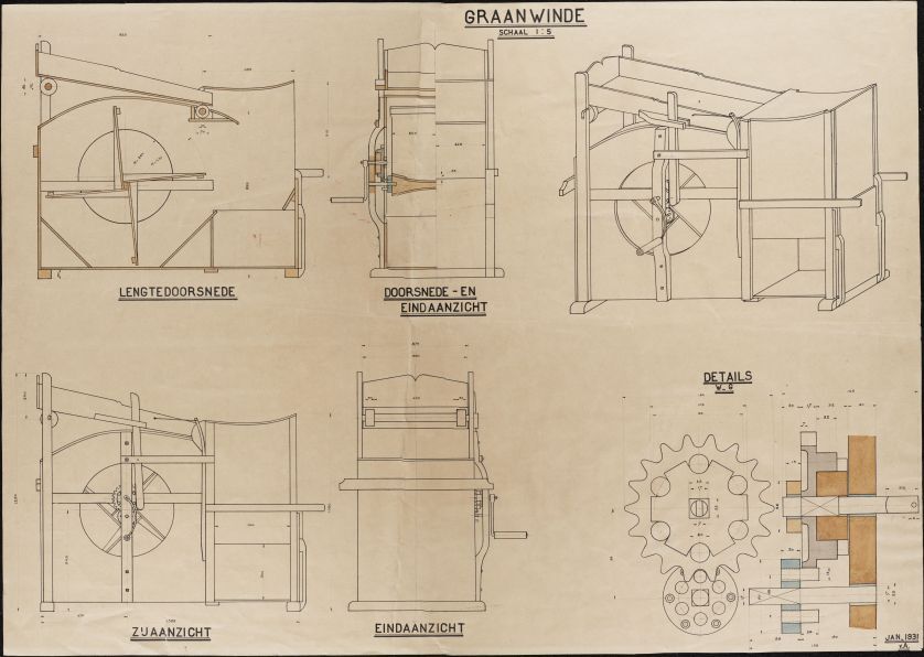 Blad met verschillende aanzichten en deatils van een graanwinde
