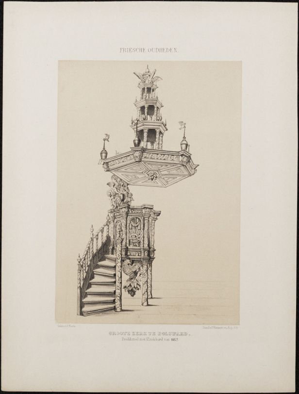 Losbladig exemplaar van het boek Friesche Oudheden (proefdruk?), met een stapel afbeeldingen