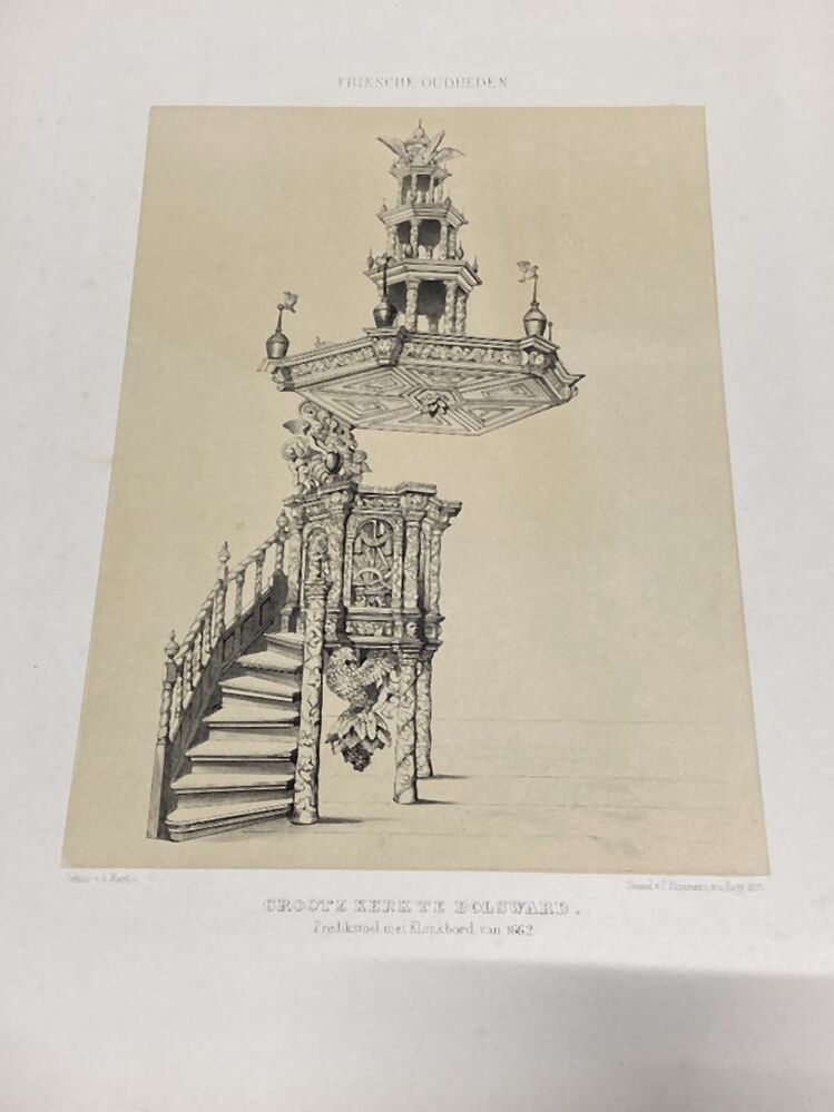 Losbladig exemplaar van het boek Friesche Oudheden (proefdruk?), met een stapel afbeeldingen