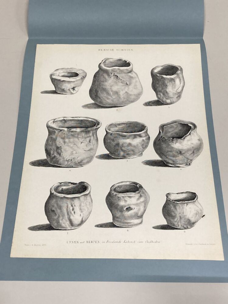 Losbladig exemplaar van het boek Friesche Oudheden (proefdruk?), met een stapel afbeeldingen