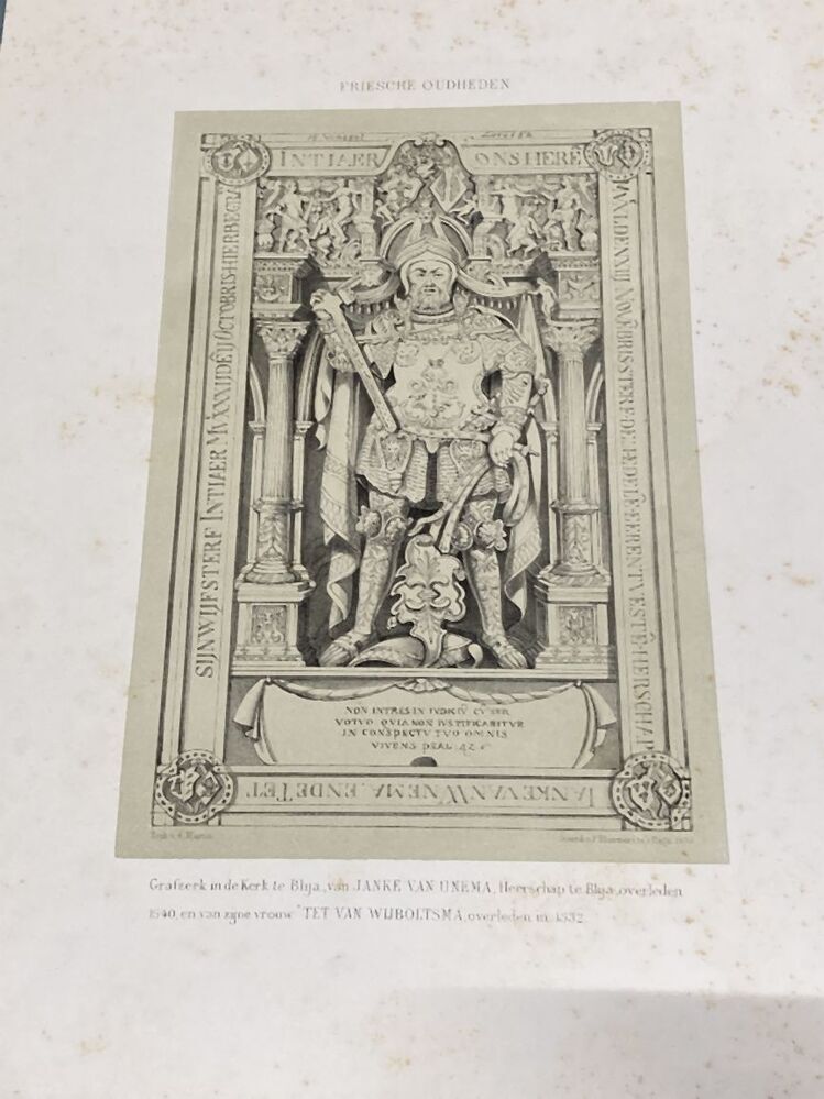 Losbladig exemplaar van het boek Friesche Oudheden (proefdruk?), met een stapel afbeeldingen